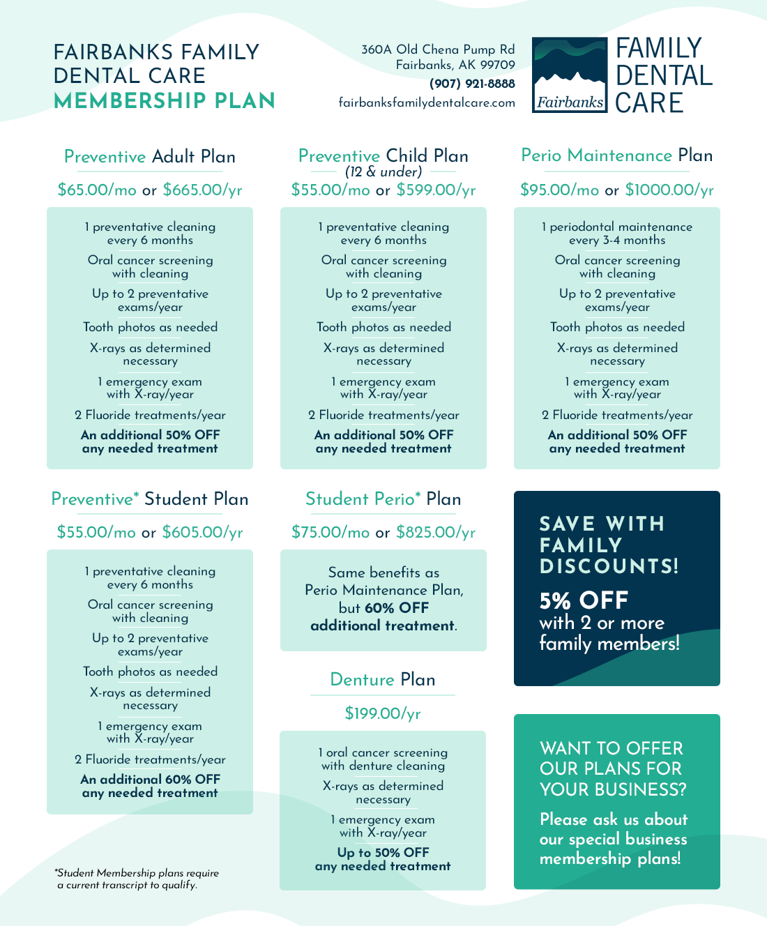 We know dental insurance is a problem, and paying out of pocket isn’t exactly…fun. That’s why we’re introducing the Fairbanks Family Dental Care Membership Plan.